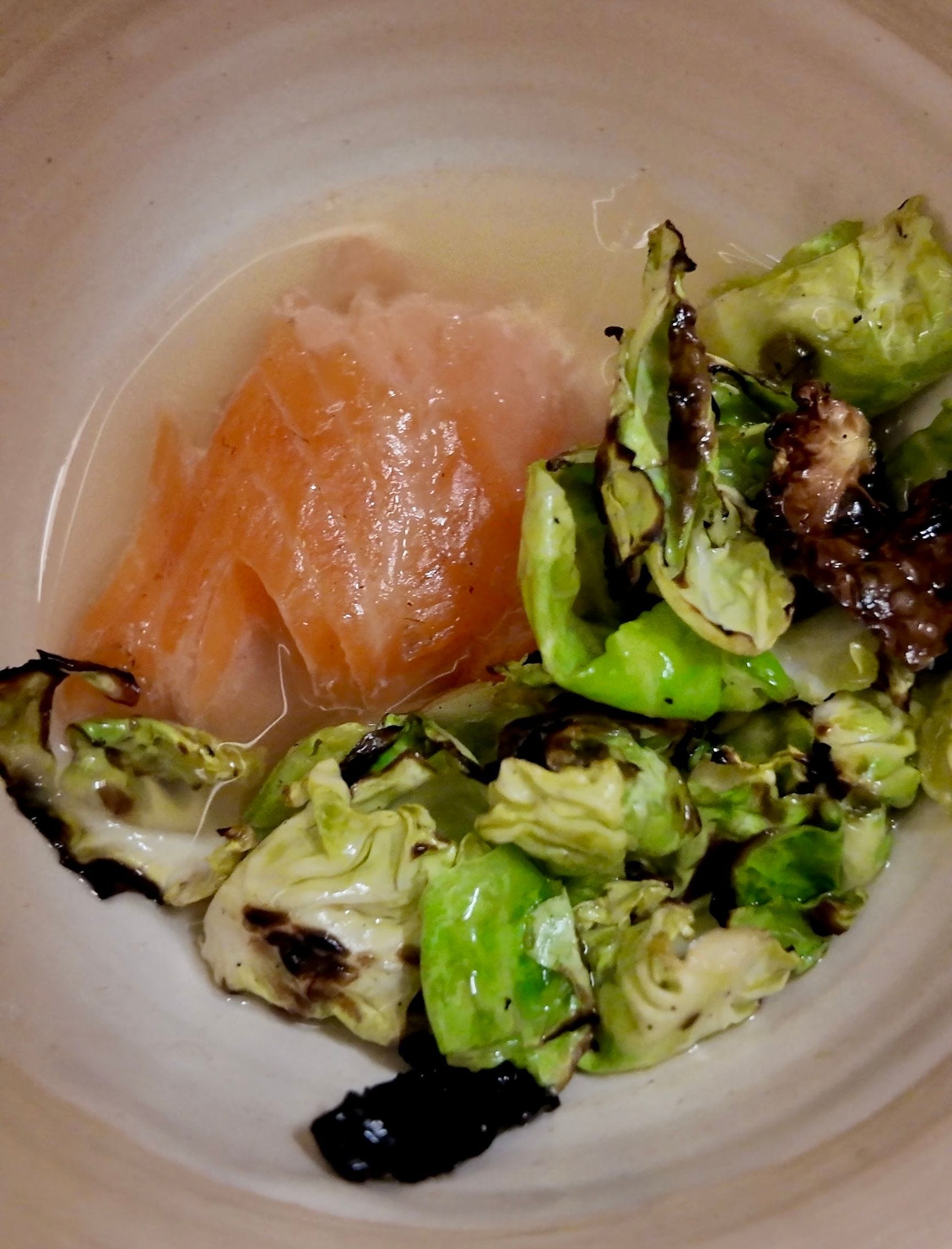 Smoked trout, Bayonne ham broth, charred brussel sprout