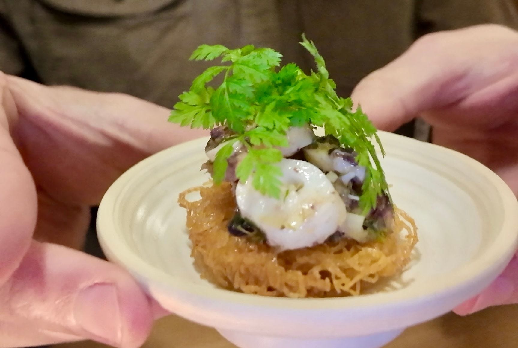 A lyonnais would recognize this classic until they took a bite. Scallop replaces pike in the quenelle, and langoustine replaces crayfish in the sauce. Horseradish oil adds an interesting top note.