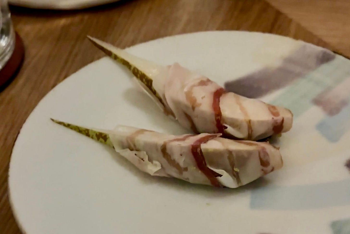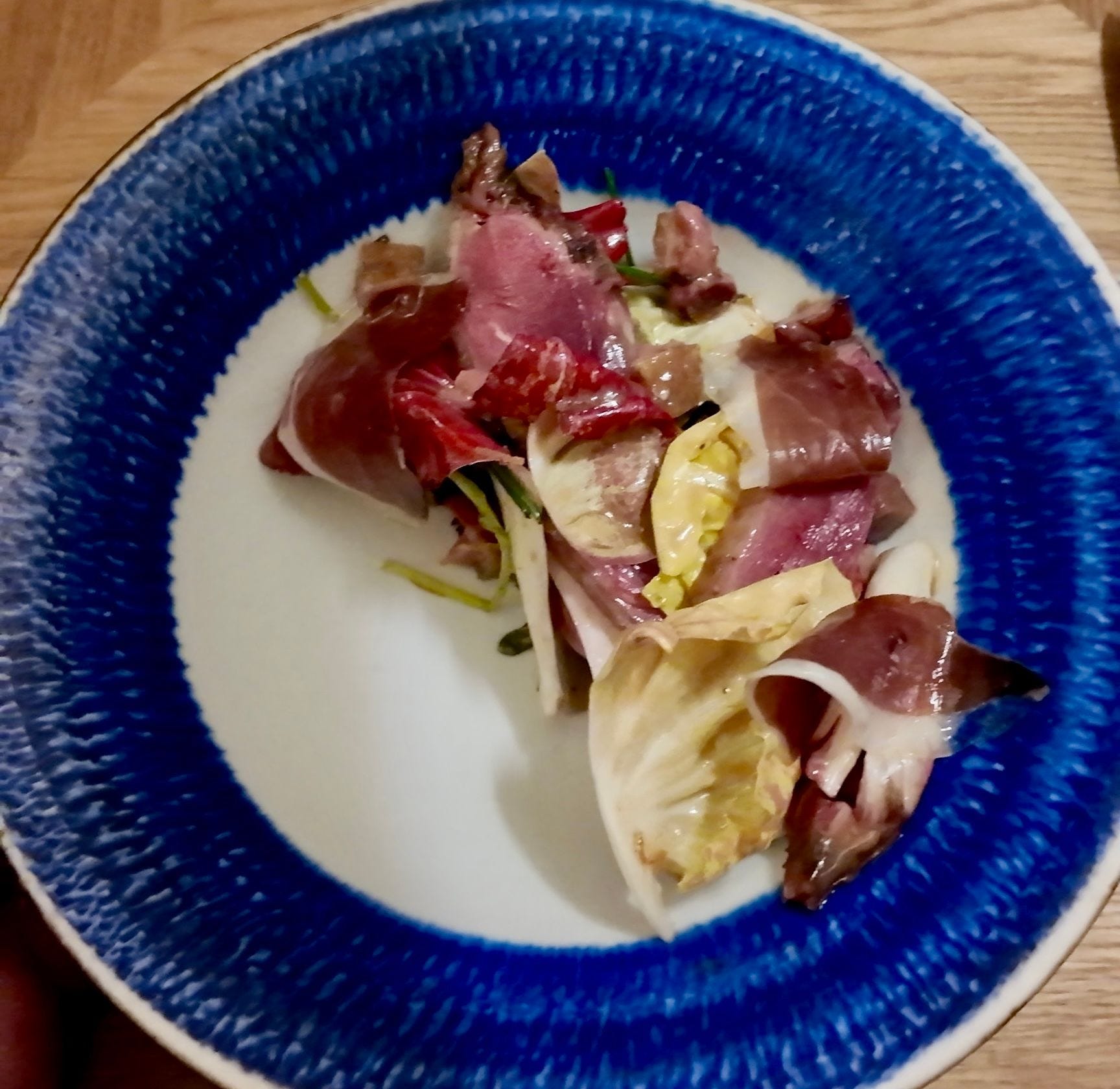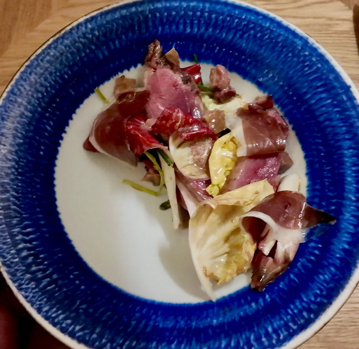 Kriaxera canette (female duck) aged one week, duck prosciutto, radicchio, duck skin lardons, chive, date vinaigrette, mystery zest