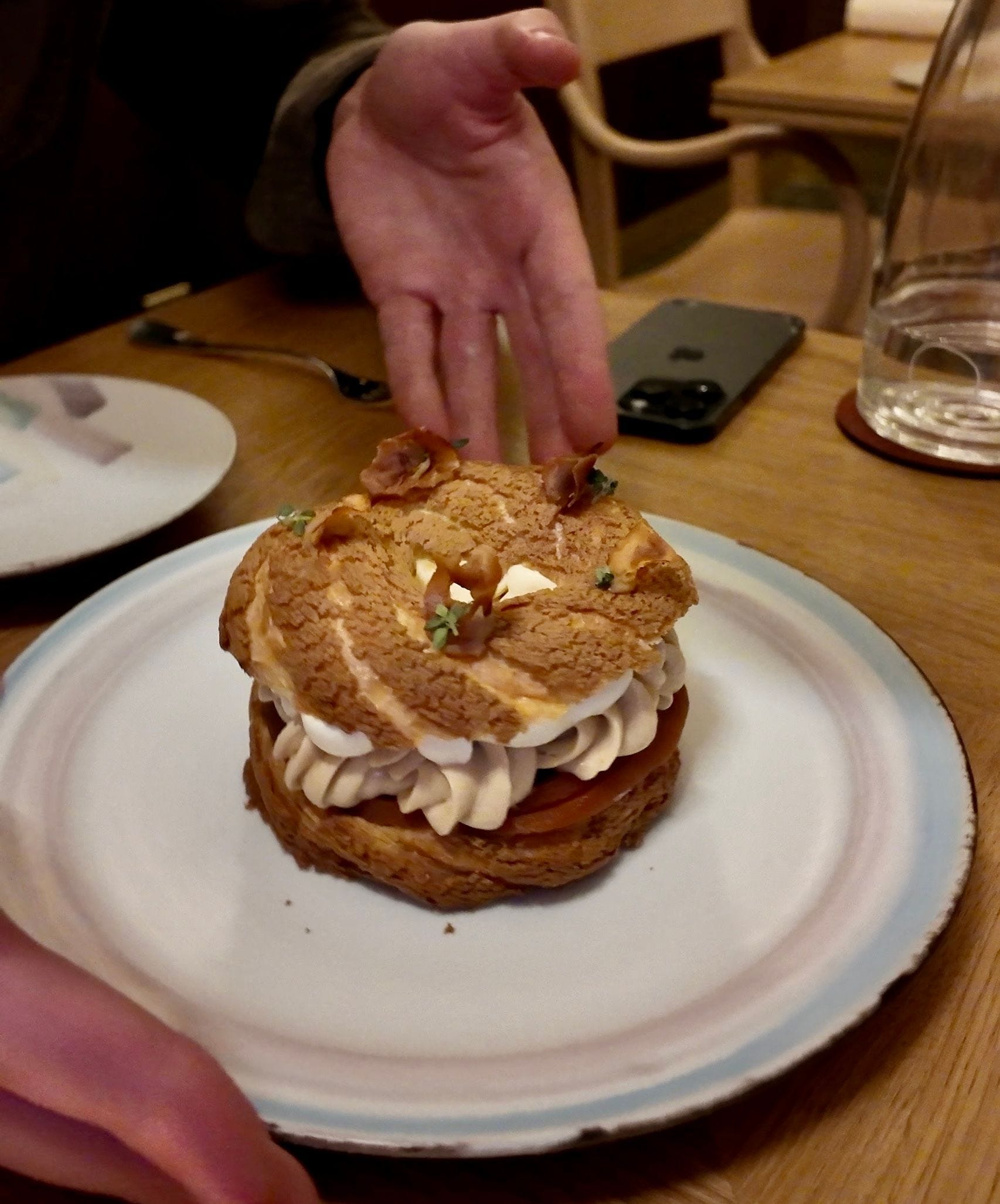 Paris Brest, hazelnut diplomat cream, confit of quince, cardamom leaf ice cream