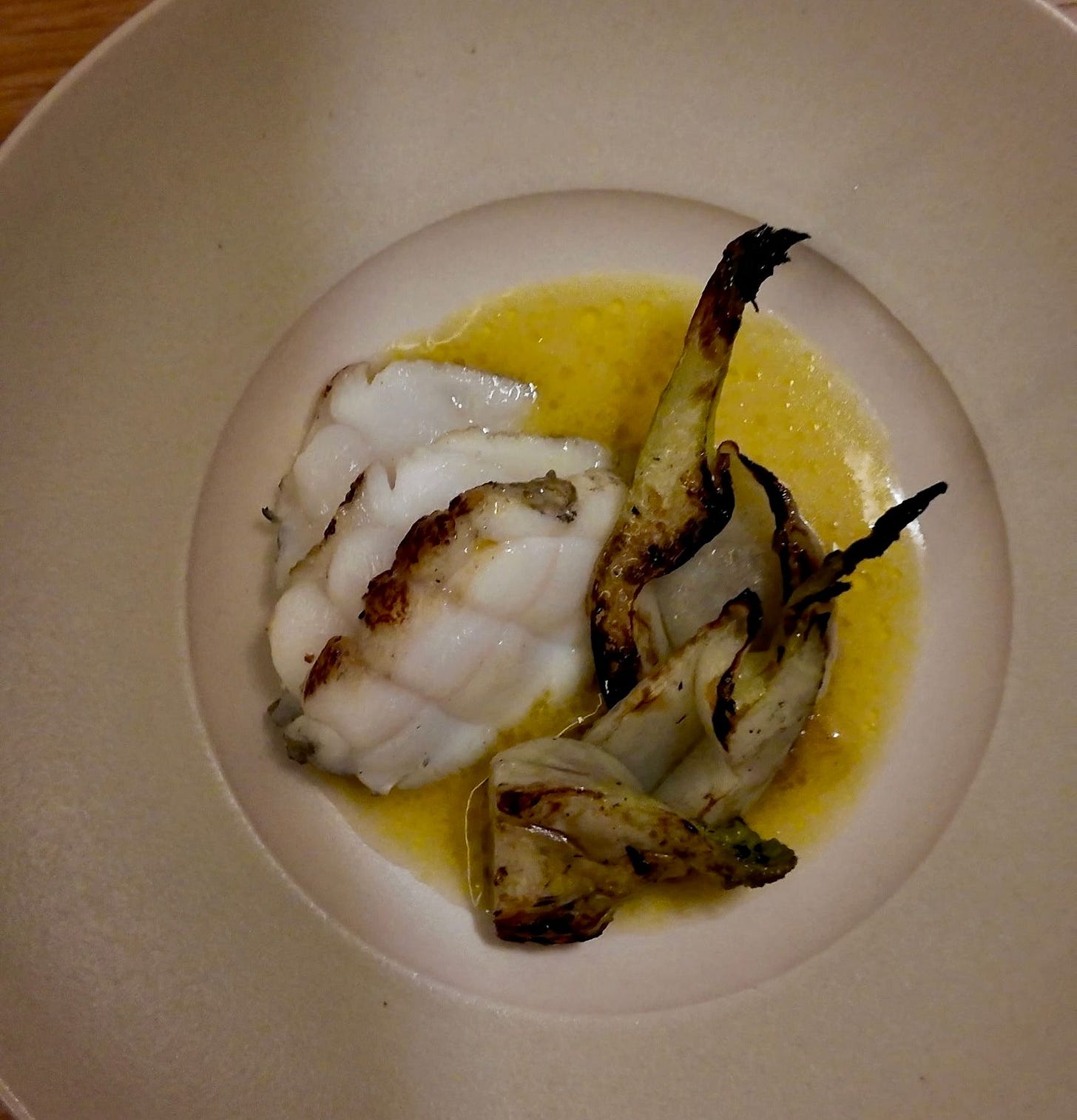 Grilled Monkfish, charred fennel, caramelized fennel purée, chamomile butter sauce