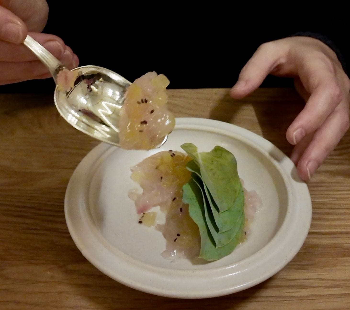 Dentex carpaccio, kiwi, tarragon, oyster leaf