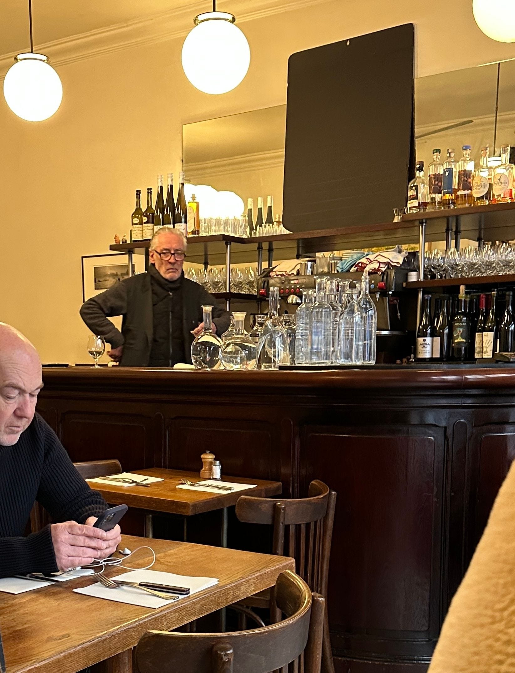 When he crossed my name off the reservation list two weeks later, I understood why. The man was on the older side, yes, but appeared to be in good health. He was just too damn zen, too present in the moment, in the bistrot, to bother with two weeks from now. He watched over his kingdom from behind the counter. Solid. Confident. Sipping his white wine. He was like something out of Greek mythology. A bistrotaur: half man, half bar. (Yes, that’s a Larry Sanders Show reference).