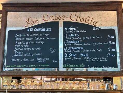 A jambon beurre. A ham and butter sandwich. I must’ve eaten hundreds over the years, but never in this context. Le Bistrot des Halles offers a whole list of casse-croûtes, as they call them, with various combinations of cheeses, charcuteries, and produits de terroir, but I was hell bent on the classic. If it was good enough to fuel the workers who rebuilt this city during Haussmann’s reconstruction, it’d be good enough to feed me.