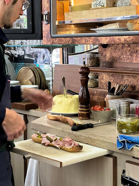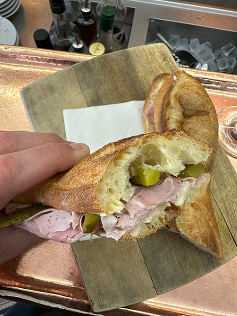 Furthermore, LARPing, or imitating, is a great strategy for travel. What better way to immerse yourself in a culture than to copy the locals? Of course, too much fetishization of one culture/class by another carries its own risks. But I’m no sociologist, and I’m not here to write an argumentative essay. I’m just here to tell you that, at this point in my life, I’ve done enough LARPing to feel comfortable in my own skin, at least enough to order a jambon beurre at Le Bistrot des Halles. And thank goodness, because it turned out to be one of the best sandwich experiences of my life.