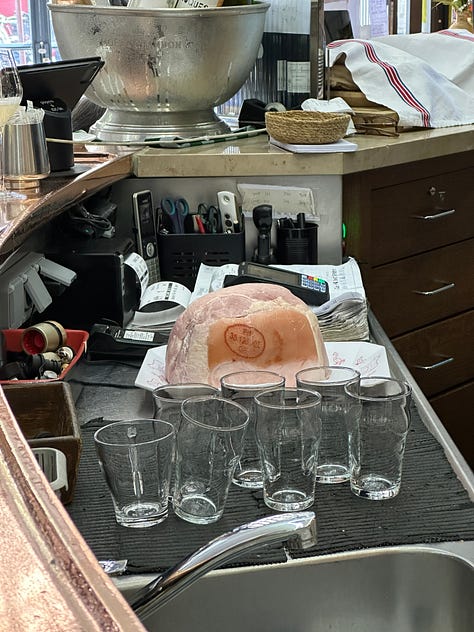 I did want cornichons. But first the ham, which, at Le Bistrot des Halles, is coupé à la minute. He plopped it onto the slicer, shaved off a pile of thin chiffonnade, and gently draped it across the buttered baguette.