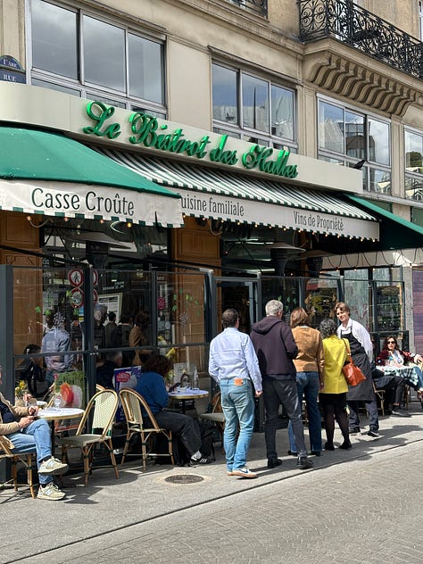 I arrived at Le Bistrot des Halles, 15 rue des Halles, Paris 75001, with a nagging craving, and one objective. At about 12:45 this Wednesday, I walked through the crowded terrace, under the striped awning and emerald sign, and into la foule. The mosaic tiling at my feet in the doorway read “depuis 1920”—a year in which this part of the city still carried its nickname “le ventre de Paris” (the stomach of Paris), given to it by Émile Zola in reference to the acres of covered market stalls, known as Les Halles, that fed the metropolis and dominated life in this quarter.