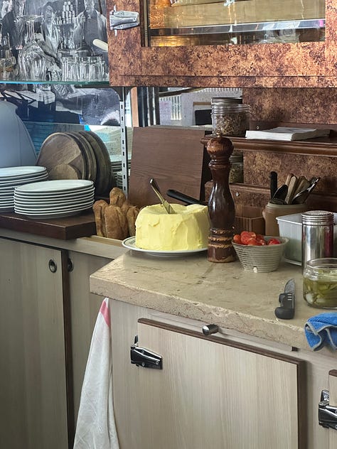 Just behind them sat a heaping mound—must’ve been five inches tall and covered the circumference of a large dinner plate—of thick, unrefrigerated butter, perfect for spreading. With a butterknife, the barman dug out a generous hunk from a divot in the top of the mass, and spread it across the bread. Then another. And another.