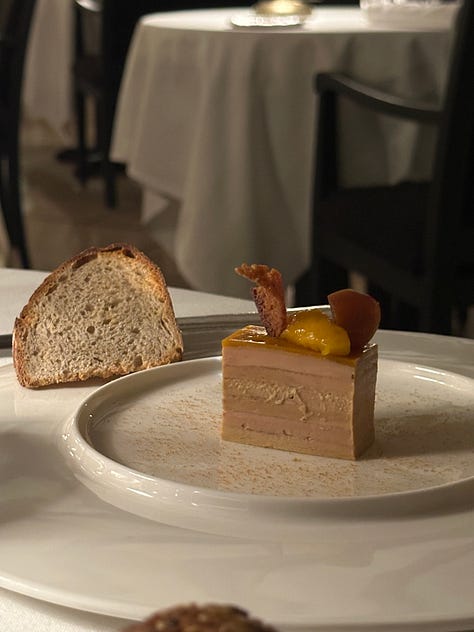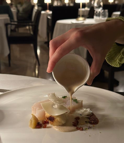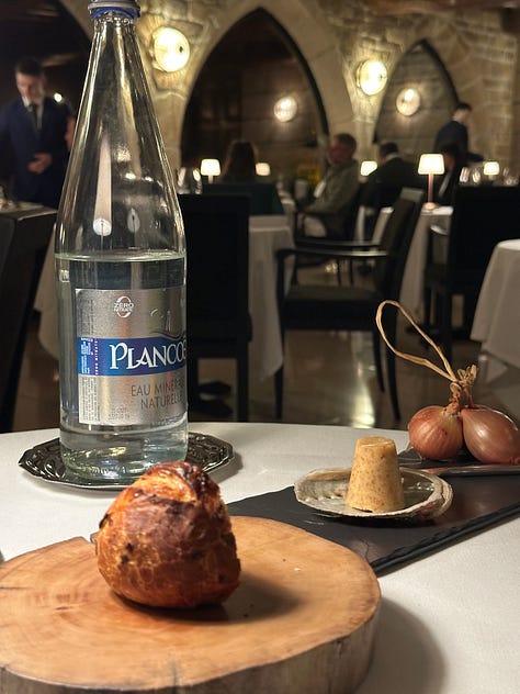 The maître de maison, in his great wisdom, suggested we enjoy an aperitif in the hotel’s bar before proceeding to the dining room. He must have sensed we were thirsty, because our coupes of extra brut vanished like liquid nitrogen poured into a sauna, and I had to fight the urge—while he escorted us to the restaurant—to tell him there was a hole in my glass. I’m only 27. That’s still too young for such remarks. Once I hit thirty, though, I’m letting ‘em rip.