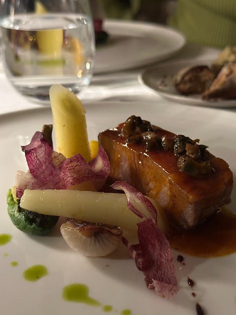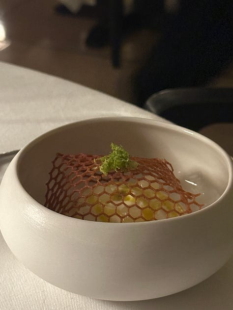 Eva, who was still nursing a glass of Chablis, was now bonding with a young man on the service staff over their shared love for Lana del Rey. I used the opportunity to chat with the sommelier, who suggested I fill my dry glass with a certain red Burgundy. That would be the best match for the rest of the menu and would even go nicely with…