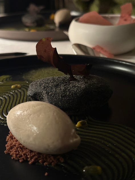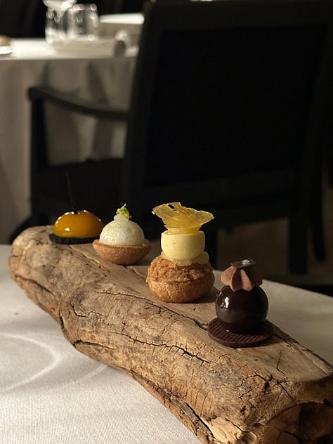 “C’est comme des petits oiseaux !” — (“They’re like little birds!”) Eva exclaimed to the server when she brought us four little mignardises—mango cream and black sesame, a lemon tartlet, a pina colada choux, and a divine chocolate ganache—aligned on a branch of drift wood. She was feeling slightly less inhibited after two glasses of wine.