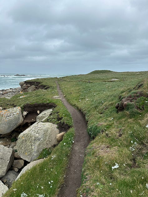 It would take us roughly four hours to walk the perimeter of the island, starting out westward from the southern port, through the small village: a cluster of granite cottages with peaked slate roofs and medieval looking doors, barely big enough for a hobbit. Some palm trees spilled out of their gardens and over the tall stone walls enclosing them.