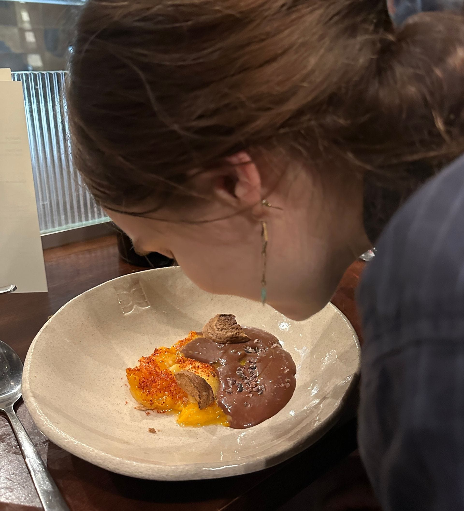 The flavor bombs continued with dishes like beef tartare with kumquat and cashew, or creamy morel mushroom pasta, but it was the veal chop with silky sauce au poivre that completely blew us away. We cut through a glistening amber brown crust into what was undoubtedly the most tender, succulent veal we’ve ever had.